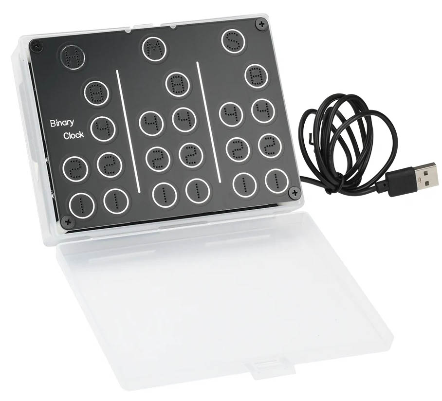 This excellent clock displays the time using the binary number system, but unlike most binary clock kits, it has a face plate with the numbers of each power of two drilled into it, so telling the time is simple as you don't need to remember the LED positions and numbers.