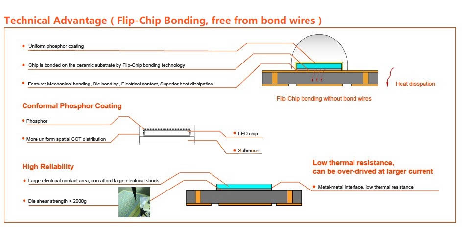 These are E-Star brand flip-chip LEDs (so have no bonding wires, for greater reliability) and are nice bright LEDs.