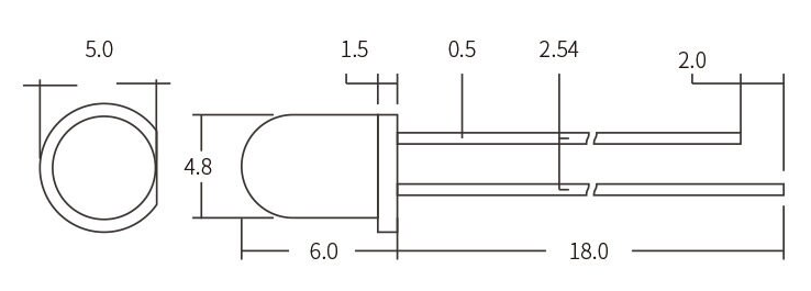 These very nice 5mm LEDs have a short 5mm body and produce a very nice warm white in the 2900-3000k range, with a CRI greater than 95. Rated output is 6000-8000mcd (8 lumens max) at a 45 degree beam angle at 20mA. Vf is 2.7-3.2V.