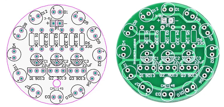 The 5mm diffuse LEDs light in groups of four, equispaced around the board, so the effect is just like an IC based running light, but simpler and easier to build.