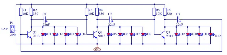 This kit uses no ICs, instead using a 3 channel relaxation oscillator circuit that uses just three transistors, and a handful of resistors and capacitors.