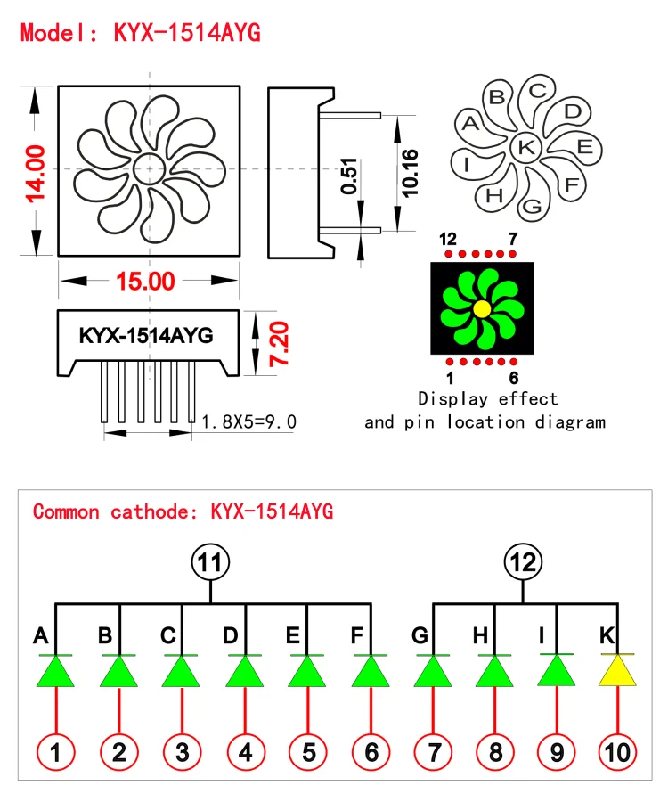 Display measures 14 x 15mm in total and is common cathode wired.